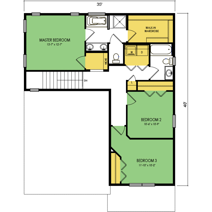 A part of our Dream Series, the Jack Pine floor plan features 2 stories, 3 bedrooms and 2.5 bathrooms, a 2 car garage, a footprint of 35x42 feet, and 1886 total square feet of living space. Floor Plan #DR270